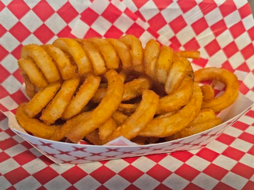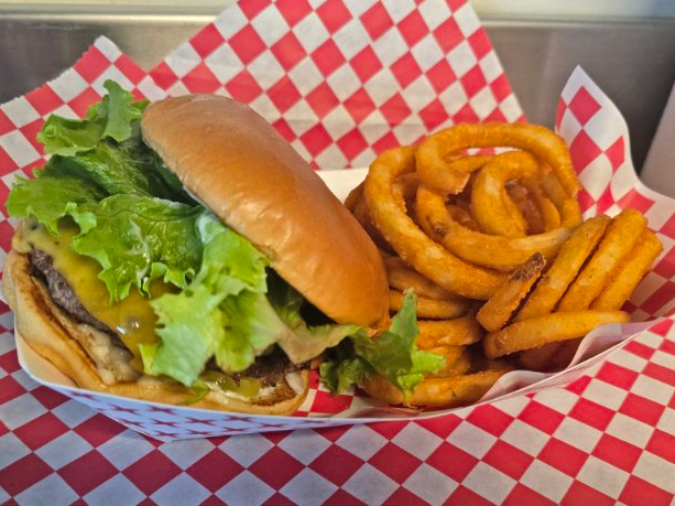 Grilled all-beef patty topped with a melty slice of fresh cheddar, lettuce, and tomato. Served with curly fries.