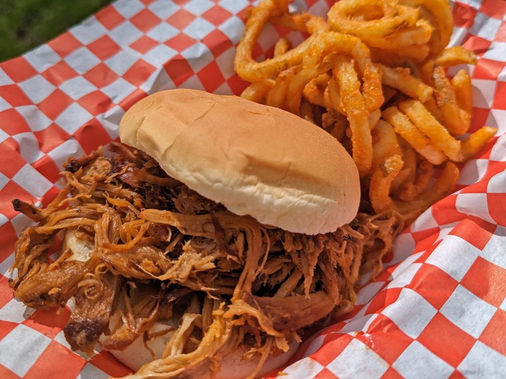 Our barbecue pork is smoked onsite for 18 hours and served on a hamburger bun. Includes curly fries.
