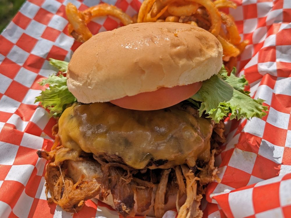 Grilled beef patty topped with smokey pulled pork, cheddar, lettuce, and tomato, with a side of curly fries.