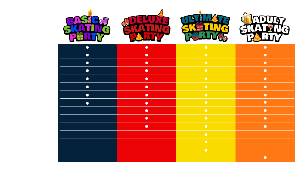 All package levels are available during the Open Skate sessions on Friday night, both sessions on Saturday, and Sunday afternoon. Reservations must be made a minimum of 3 days in advance. The location of the reserved table is in an area that has a physical occupancy limit, therefore the maximum number of guests allowed is 12; no exceptions. Have your guests fill out the mandatory waiver before they arrive. Waivers for minors must be completed by a parent or guardian.