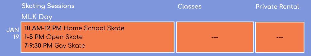 Private Rink Rentals require advance reservations. Intro to Roller Skating and Contemporary Rec classes require advance registration.